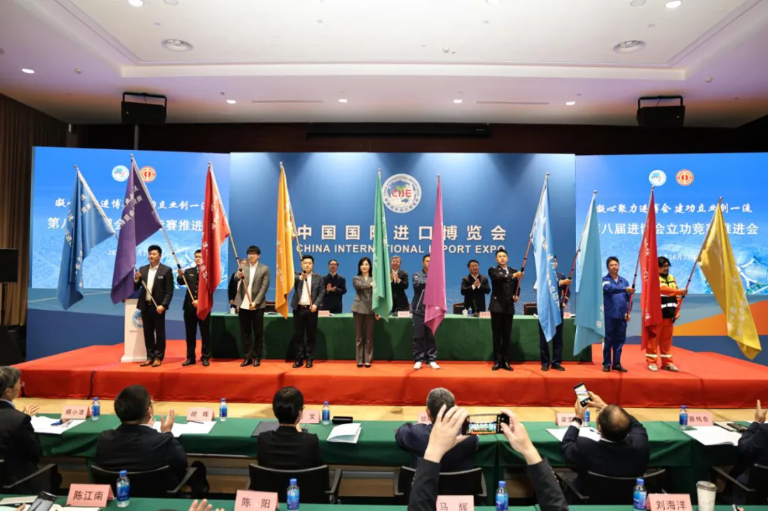 会上,为来自市商务委、市市场监管局、上海海关、上海边检总站、市消防救援局等20支第八届进博会立功竞赛参赛队伍代表授旗。