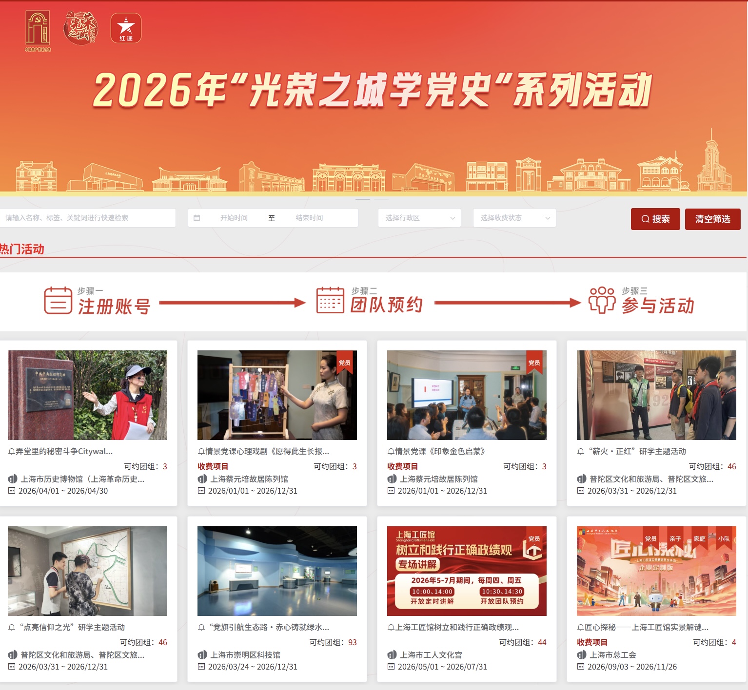 党史学习活动目录可于上海市市级机关党建网下载。活动已在上海红色文化资源信息应用平台“红途”首页上线,各党支部可登录预约(网页地址:https://htxch5.shshxc.cn/tuanyue/home)。
